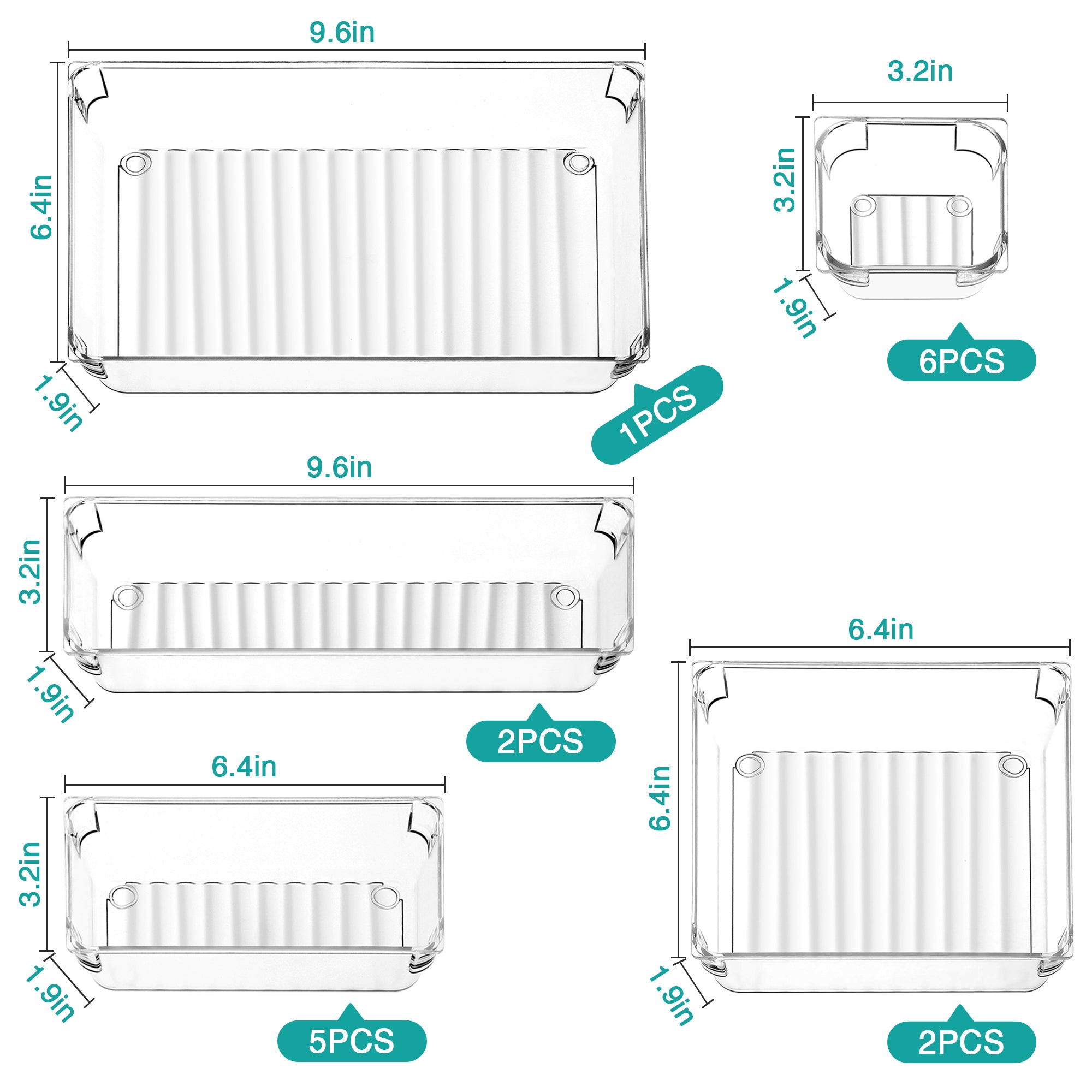Package Included:1 x Drawer Organizer(9.6" x 6.4" x 1.9")2 x Drawer Organizer(6.4" x 6.4" x 1.9")2 x Drawer Organizer(9.6" x 3.2" x 1.9")5 x Drawer Organizer(6.4" x 3.2" x 1.9")6 x Drawer Organizer(3.2" x 3.2" x 1.9")