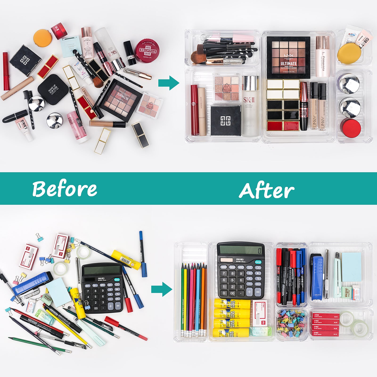 Cosmetic StorageA necessity tip for beauty lovers. Categorize brow pencil, concealer, styling gel, mascara, etc in different sizes of bins quickly without effort.